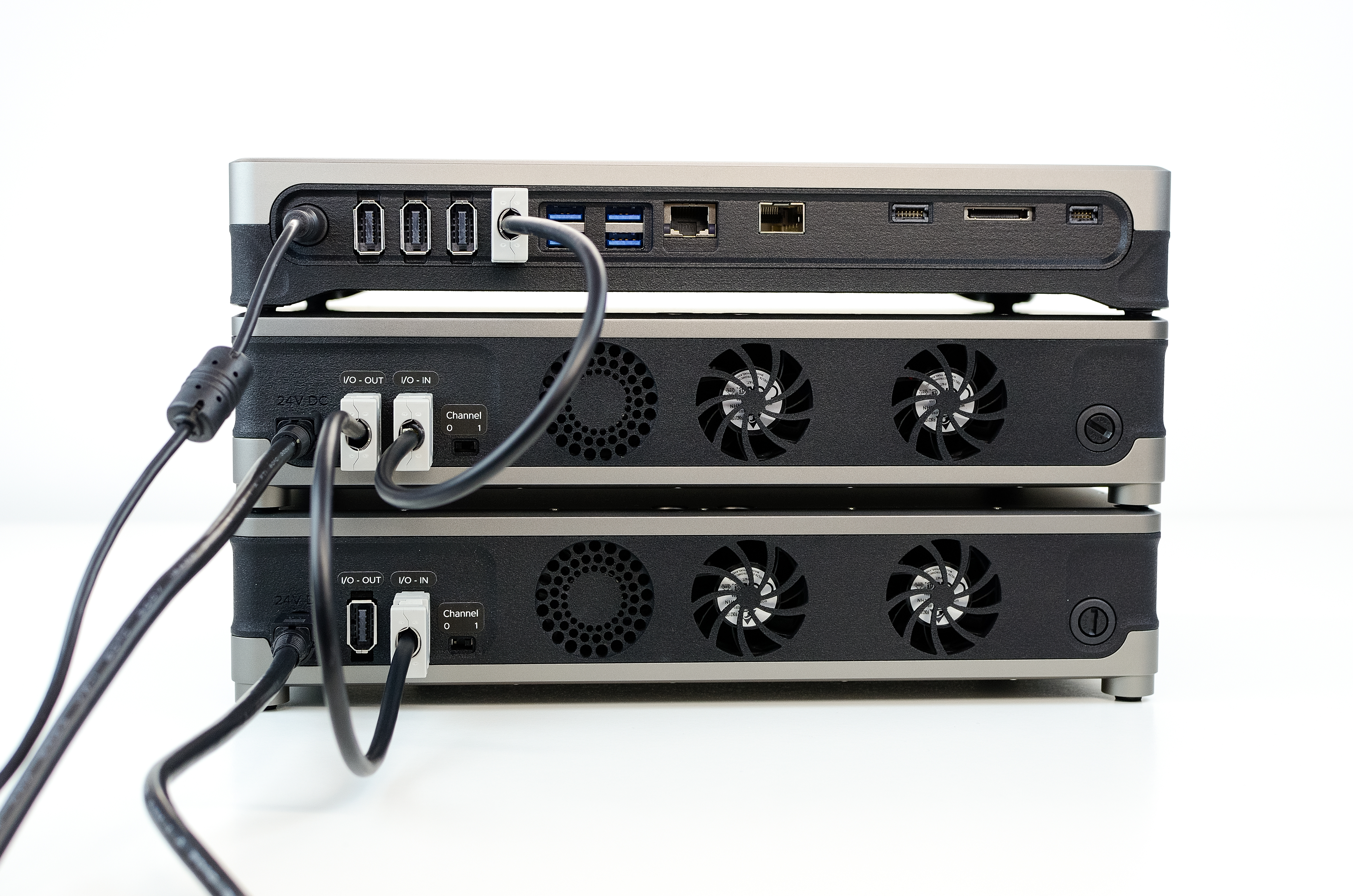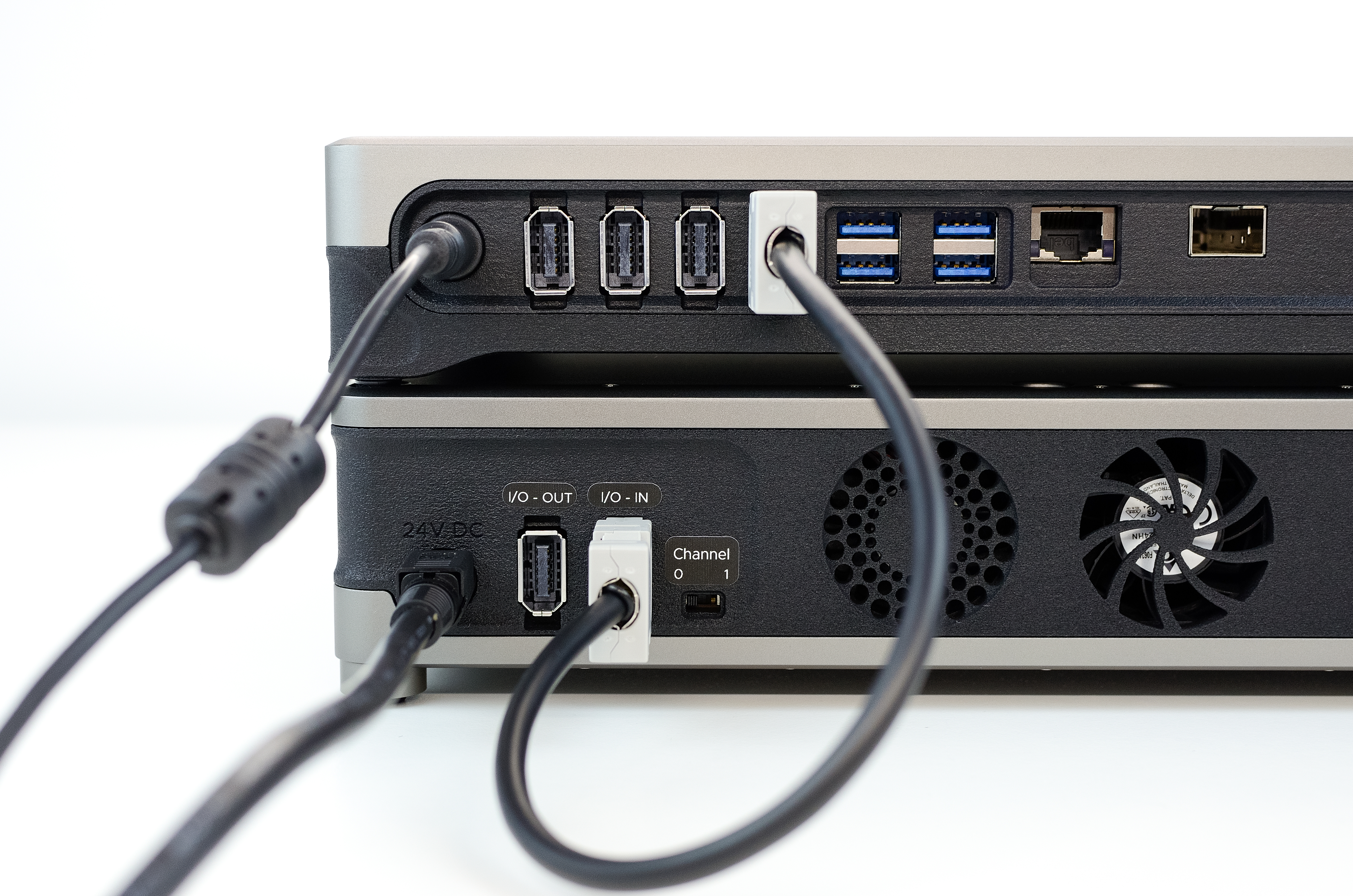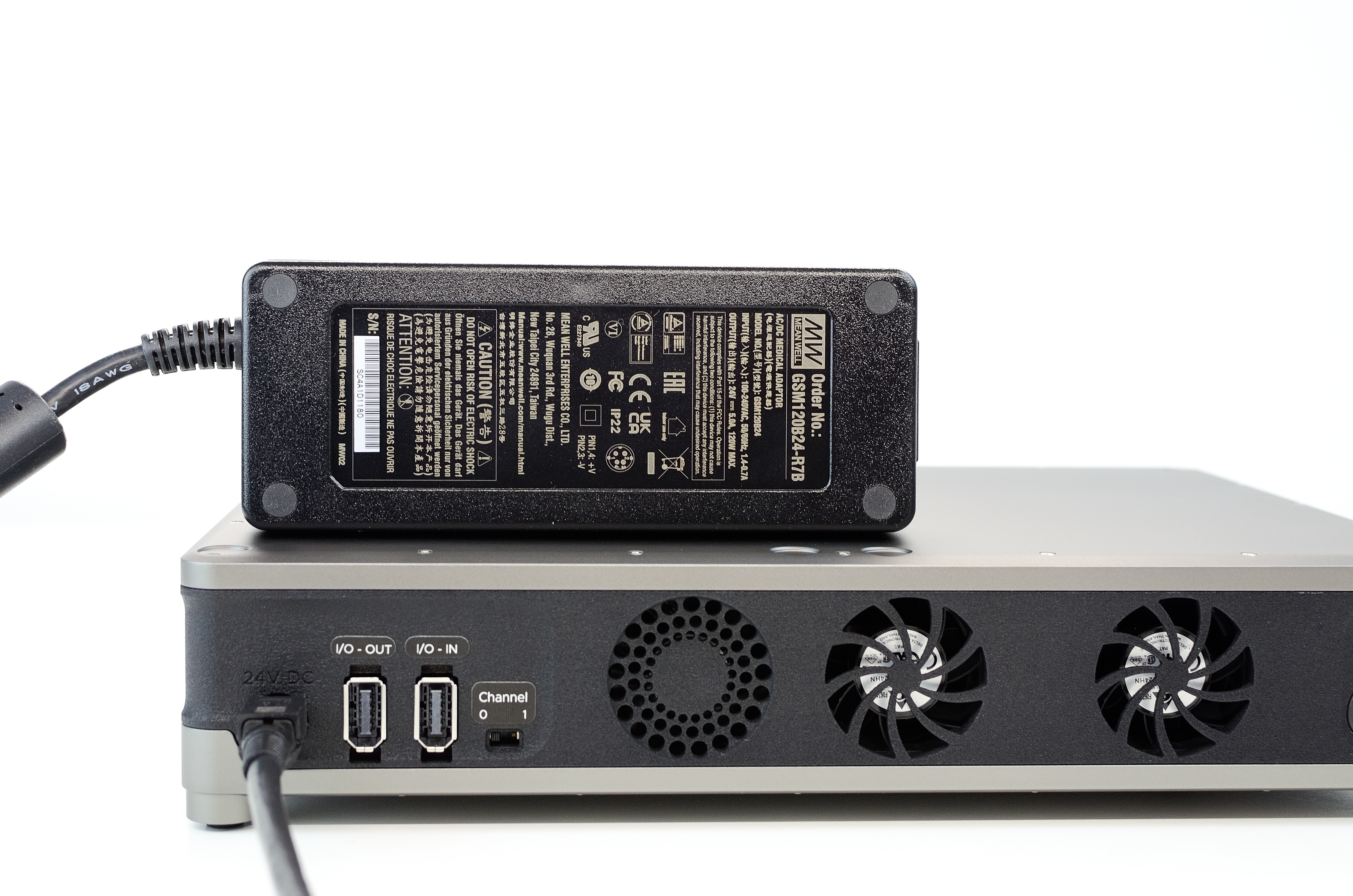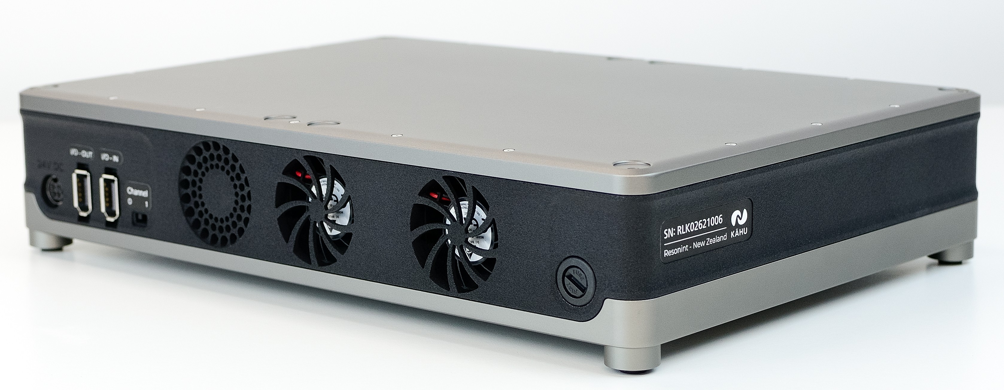 Complete the initial rear Kāhu connections as explained in the Connections section. Connect the 24V, 120 W external power brick to the amplifier and connect GPIO port 0 of Kāhu to the I/O IN port of the amplifier. Ensure the Channel switch is set to 0.