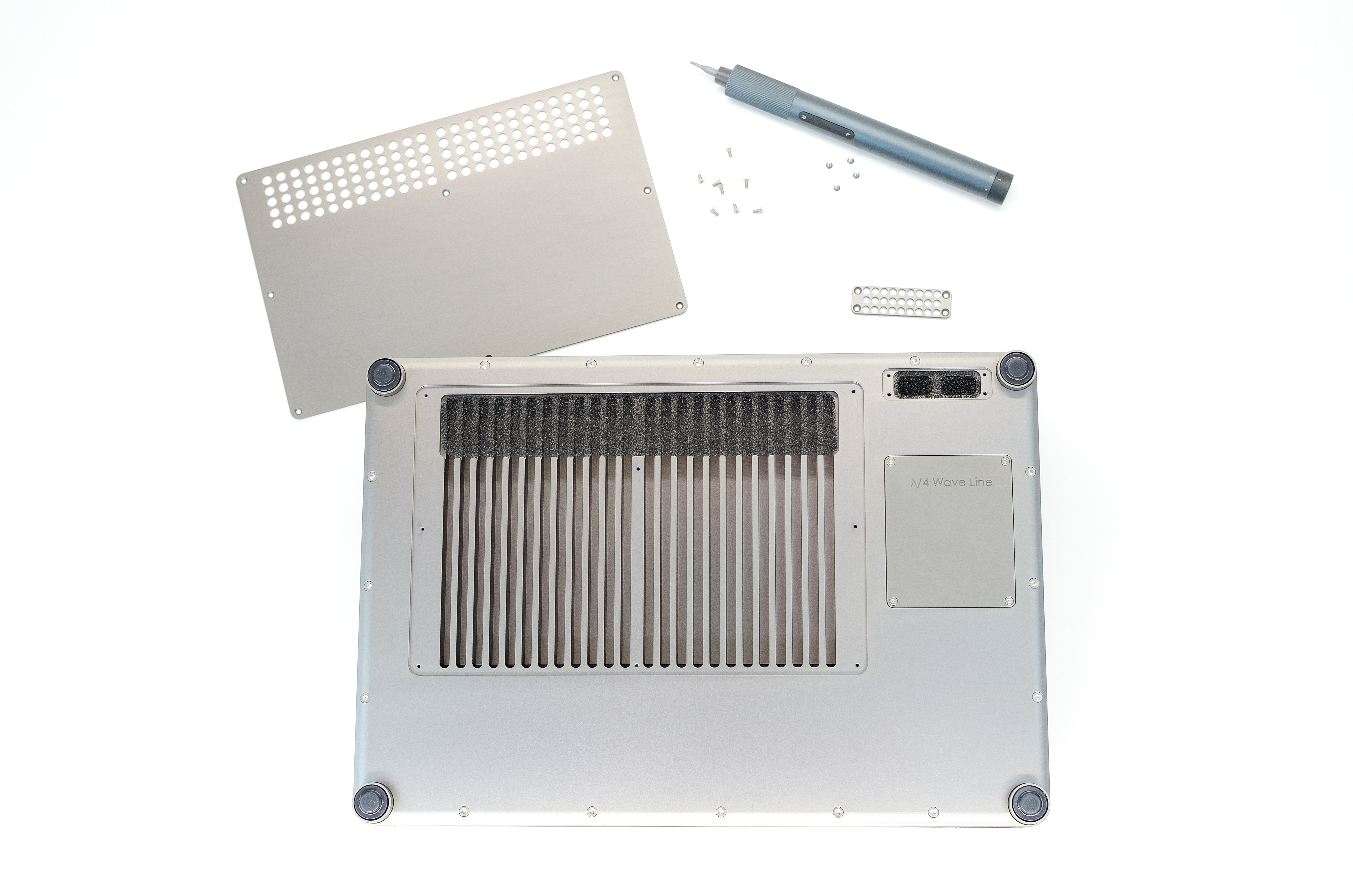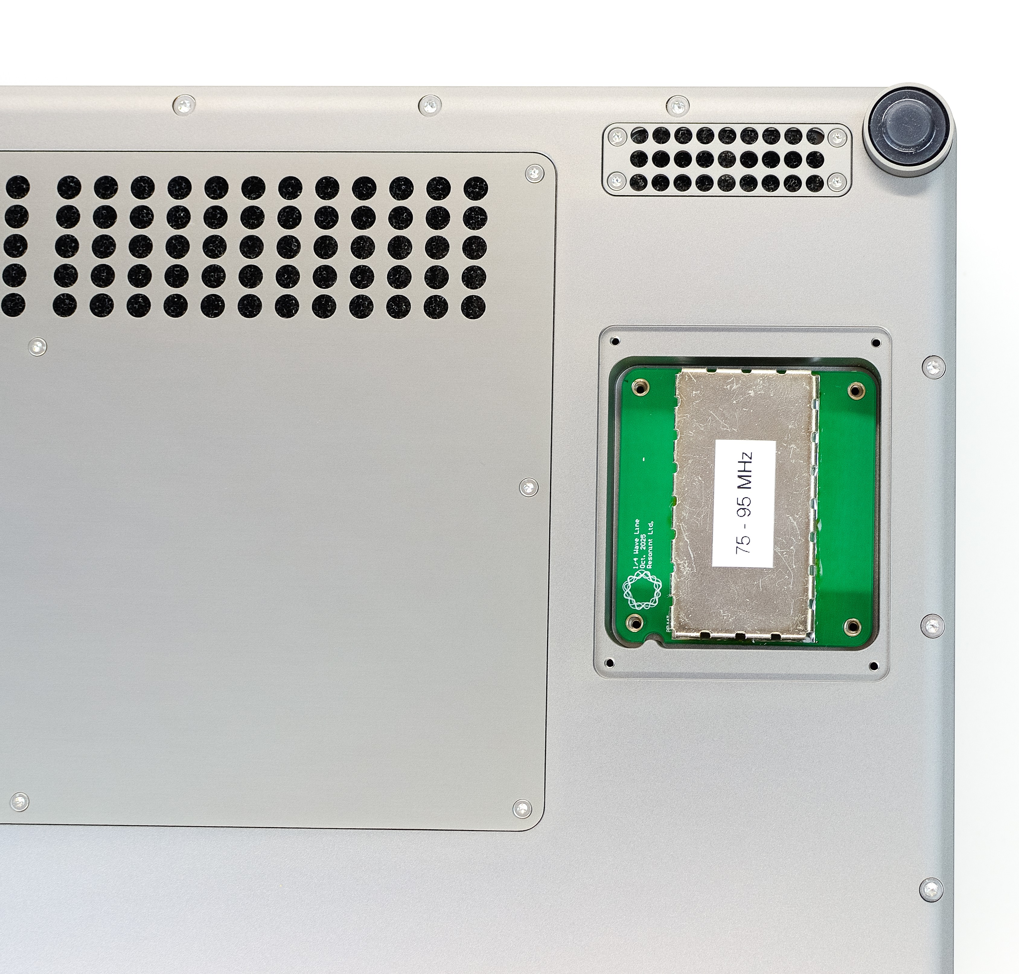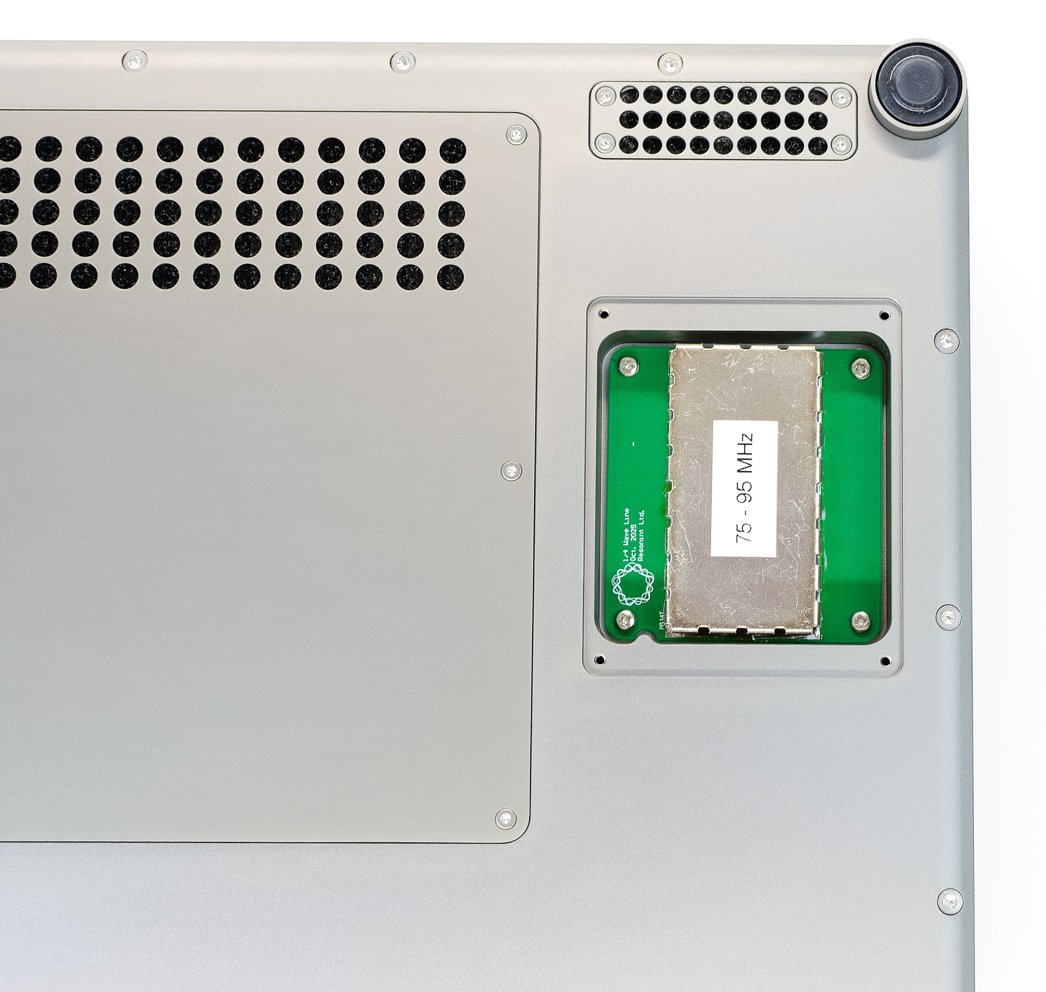 Insert the alternative quarter-wave line module, taking care to correctly align the notch on the bottom left. Press to click it into place and fasten the 4 phillips screws to secure it. Finish by refitting the panel.