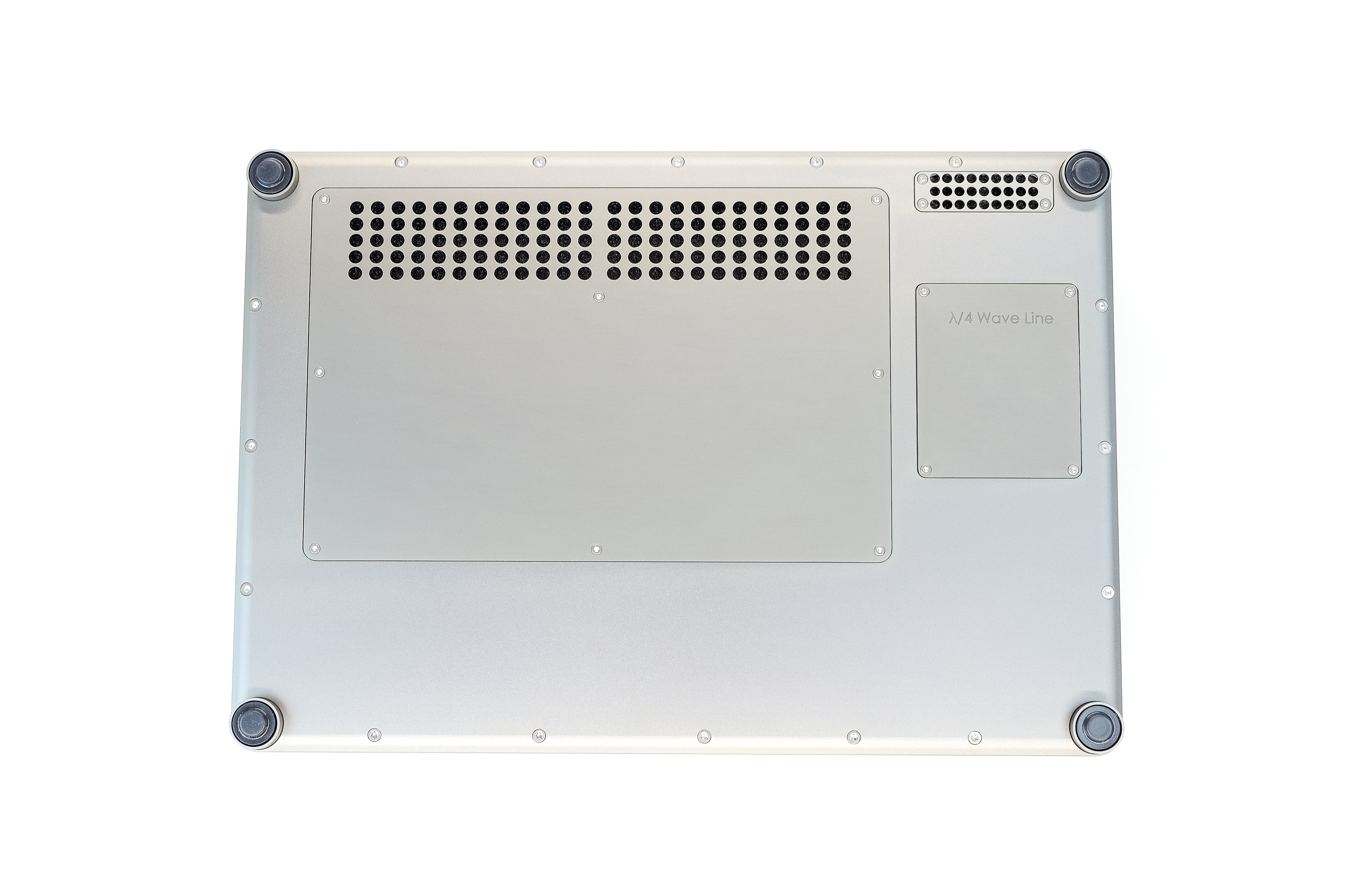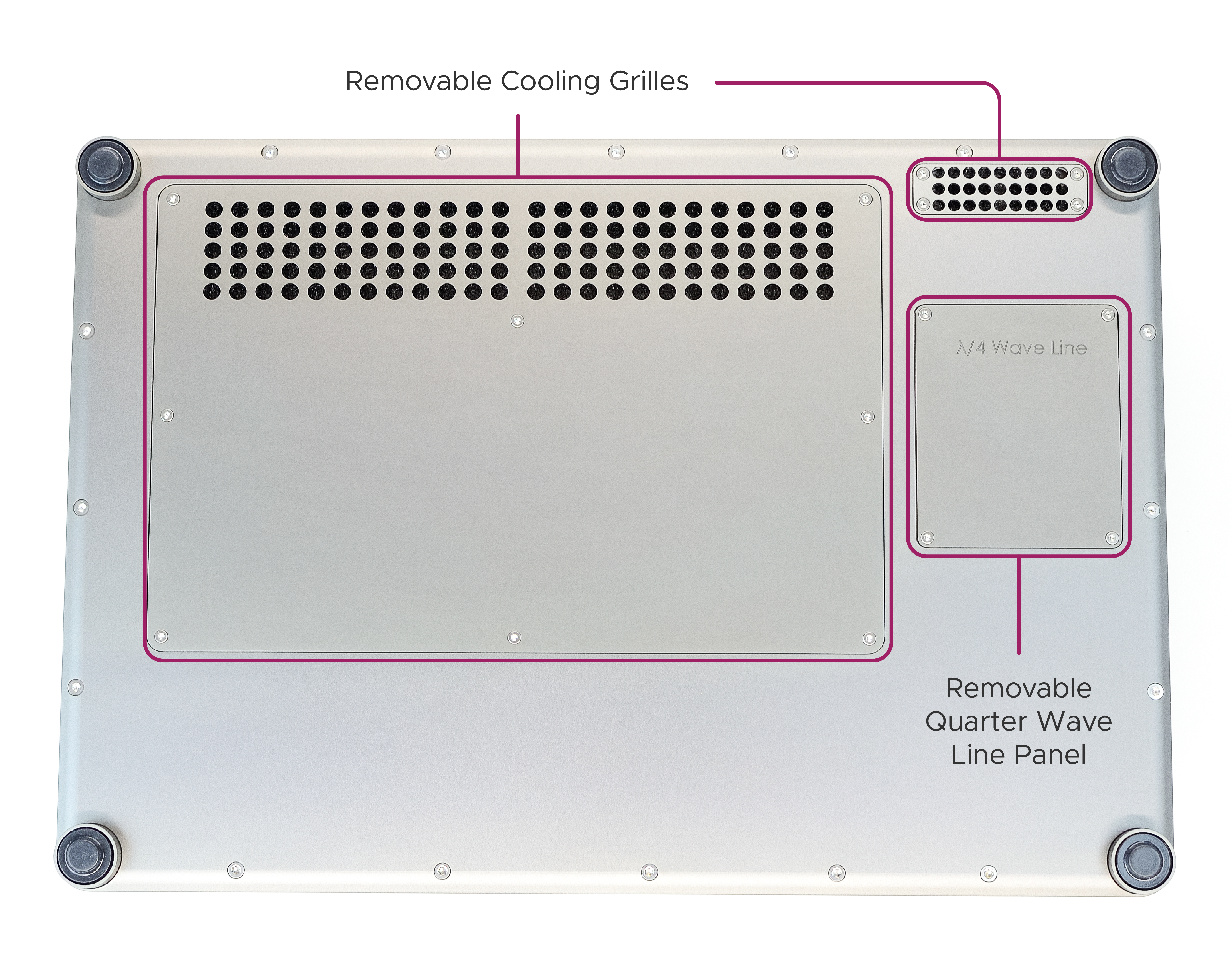 On the underside of the module there are three removable panels. Two of these are cooling grilles which provide access to the dust filters when removed. The filters should be cleaned when dust has accumulated to ensure adequate airflow. The other panel may be removed in order to change the quarter wave line module.