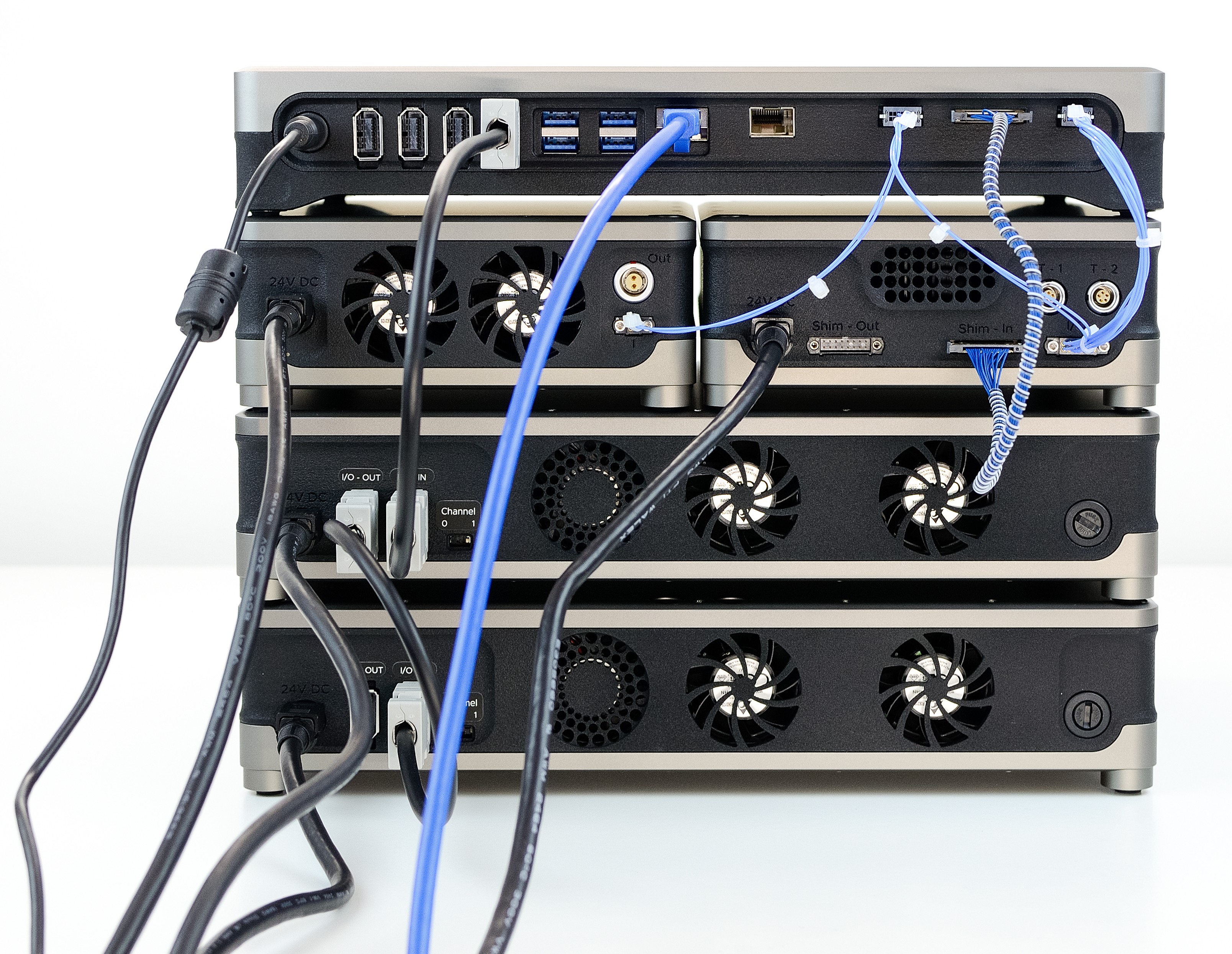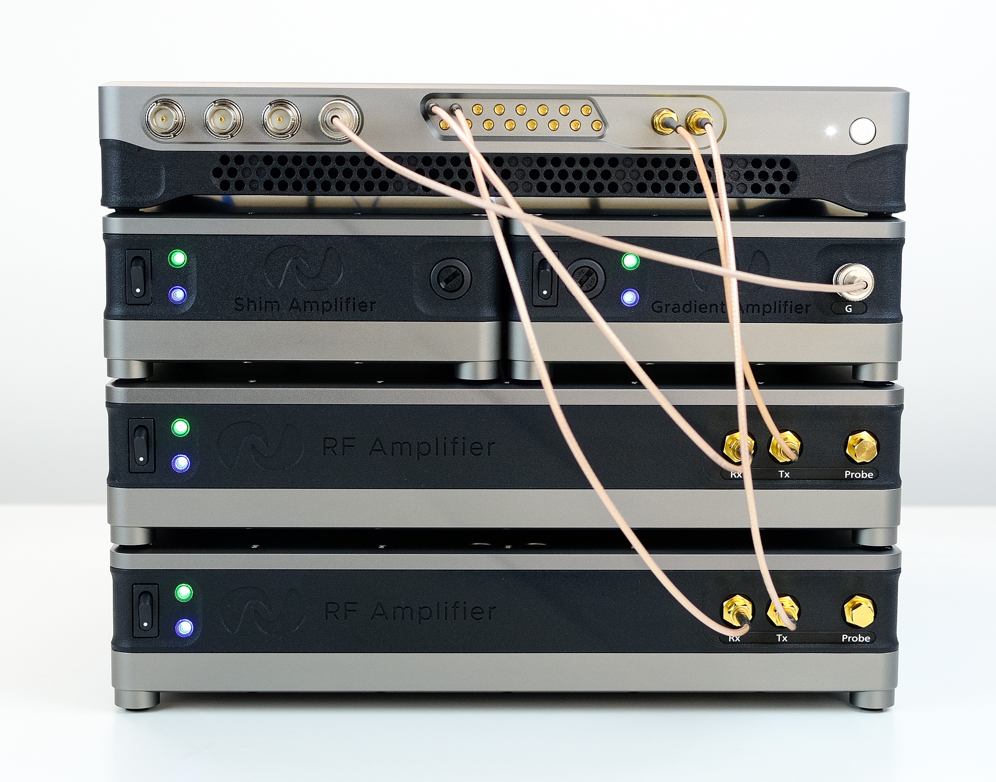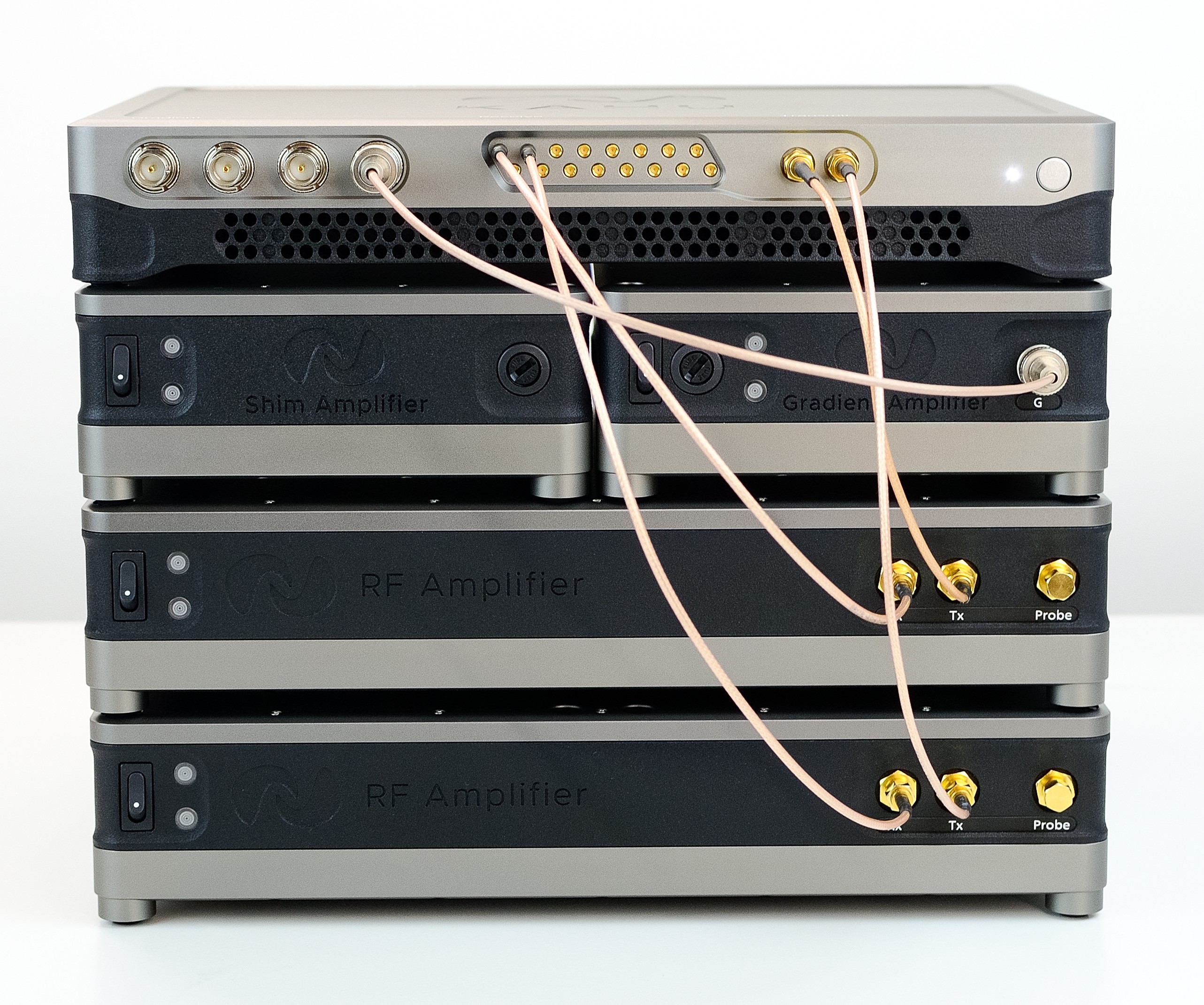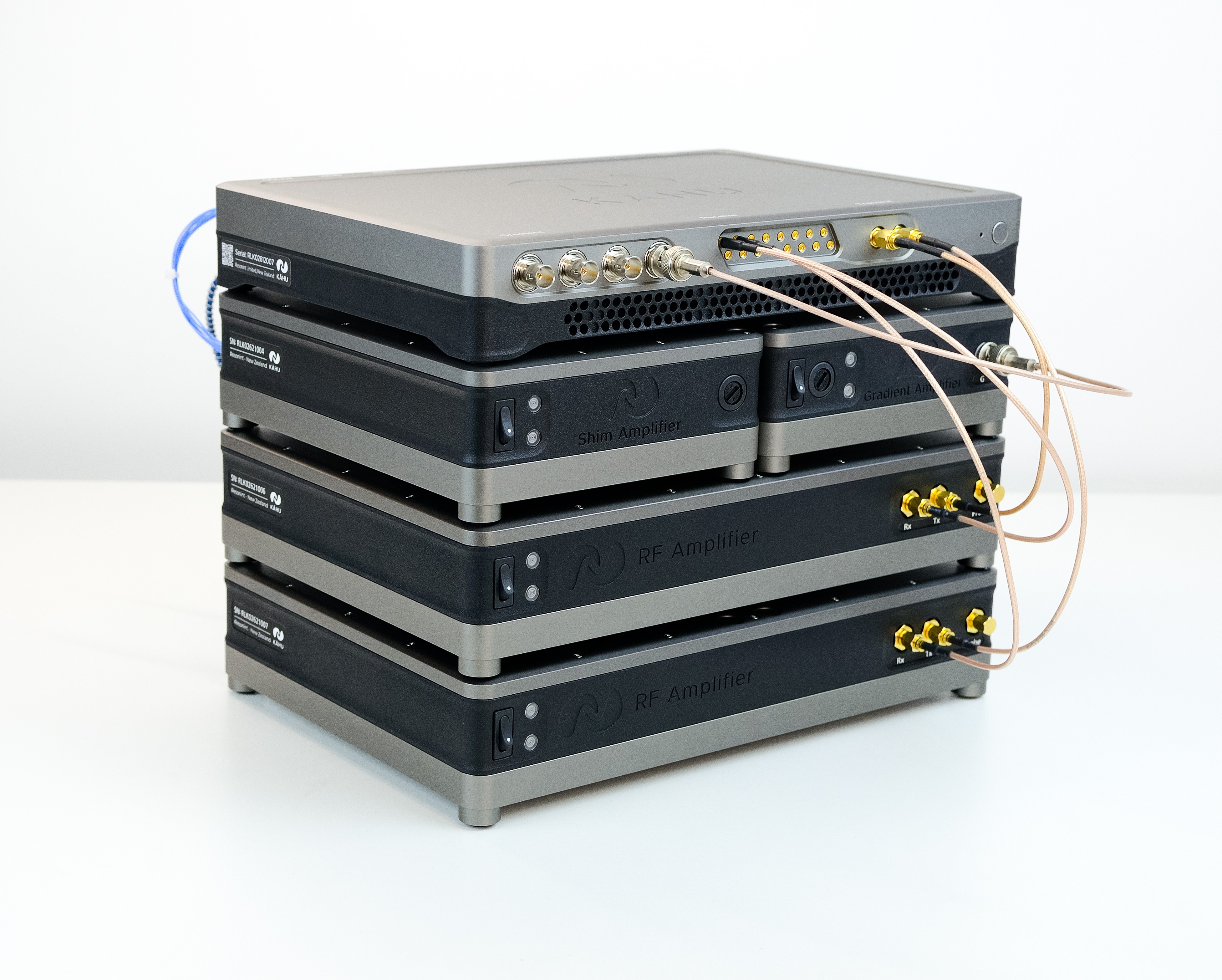 Begin by stacking the modules as shown below, with the two RF amplifier modules at the base of the stack, followed by the Shim and Gradient Amplifiers and with Kāhu on the top. When viewed from the back, the gradient amplifier is on the left and the shim amplifier on the right.